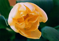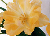 | 少し開いたチューリップ。 八重の花びらが、折りたたまれて。 花弁のふちのrosy purpleのふちどり ってこれではわからないですね。 とってもうすい色で外側だけだと思います。 | |