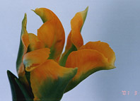ビリデ咲き(Late-Flowering Tulips、Viridiflora Group) 1959年に登録されたチューリップ アーティストの変異種で輝くようなオレンジの花びらに グリーンはストライプ状に幅広くはいる。