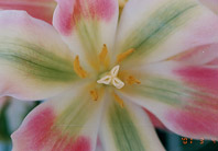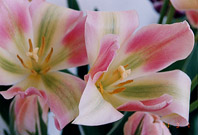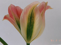 ビリデ咲き(Late-Flowering Tulips、Viridiflora Group) 私の持ってる本には詳しい資料がありません。 花の形は、花びらがとんがってユリ咲き風、花びらに緑のフレイムがあります。 サテンのような光沢のあるピンクの花びらが美しい。