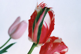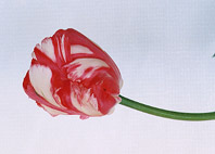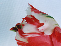 パーロット咲き(Late-Flowering Tulips、Parrot Group) 1954年に登録されたチューリップ 濃い赤い色のフレイムとストライプが花びらに入る白い花 あんまりいい写真がありませんが、また挑戦します。 手に入るかな?