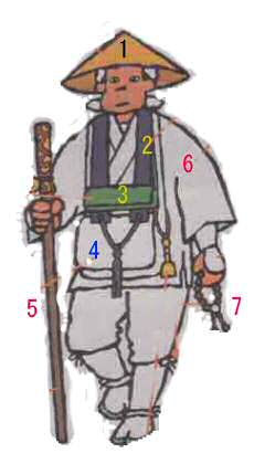 - 頭陀袋(4,ずだぶくろ)、地図、タオル、納経帳、お経の本などを入れます。( 2,000円前後)