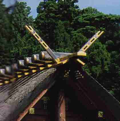 伊勢神宮の千木(ちぎ)と堅木(かつおぎ) 千 木 の 切 り 口千 木 の 切り口を見れば 祭 神 の 男 女 別 が分かります。出雲大社の 千 木 を見れば 垂 直 に切ってあるので 祭神 は 男性 であり、下の写真にある伊勢の皇大神宮は 女性 である 天照大神 ( あまてらすおおみかみ ) を祭神 とするために、切り口を 水 平 に してあります。
