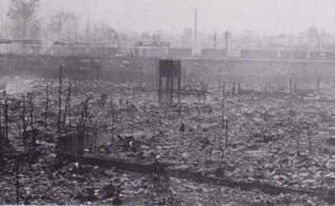 被 災 し た J R 大 塚 駅 の 周 辺J R 山手線、大塚駅北口 の 焼 け 跡 で 、左 端 の ビ ル が 白 木 屋 デ パ ー ト( 現 ・ 大 塚 ビ ル )で す。空襲 当時 火 に 囲 まれ 、 デ パ ー ト の 地 下 に 逃 げ 込 んだ 人 達 6 0 人 が 、全員 焼 死 したと いわれて いま した。![]()