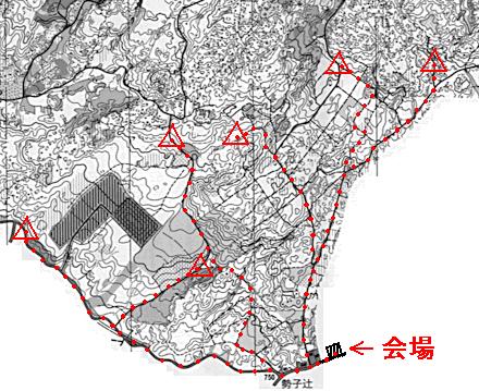 勢子辻青少年の家になったことから、まずスタート位置の候補を推測する。1.5kmの距離から以下の各点が候補として考えられる。普通1.5kmが平地なら20分というところだが、所要時間が25分になっているので、ややアップがあるかもしれない。ということは北方向に登って行く方の可能性が高いか?