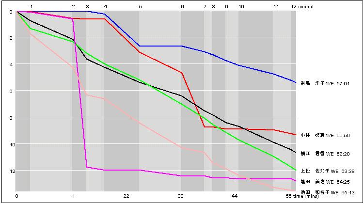 実はすでにこの時、小林は一度横江に追いついている。中盤の緩斜面の難度の高いコントロールで小林は直進、横江は下に迂回し、横江が小林を振り切ったらしい。小林はその後も斜面のコントロールでミス。一度は追いついた横江に差を広げられた。横江が62分でゴールしトップにたった直後、小林は60’56でゴール。かろうじてトップとなる。