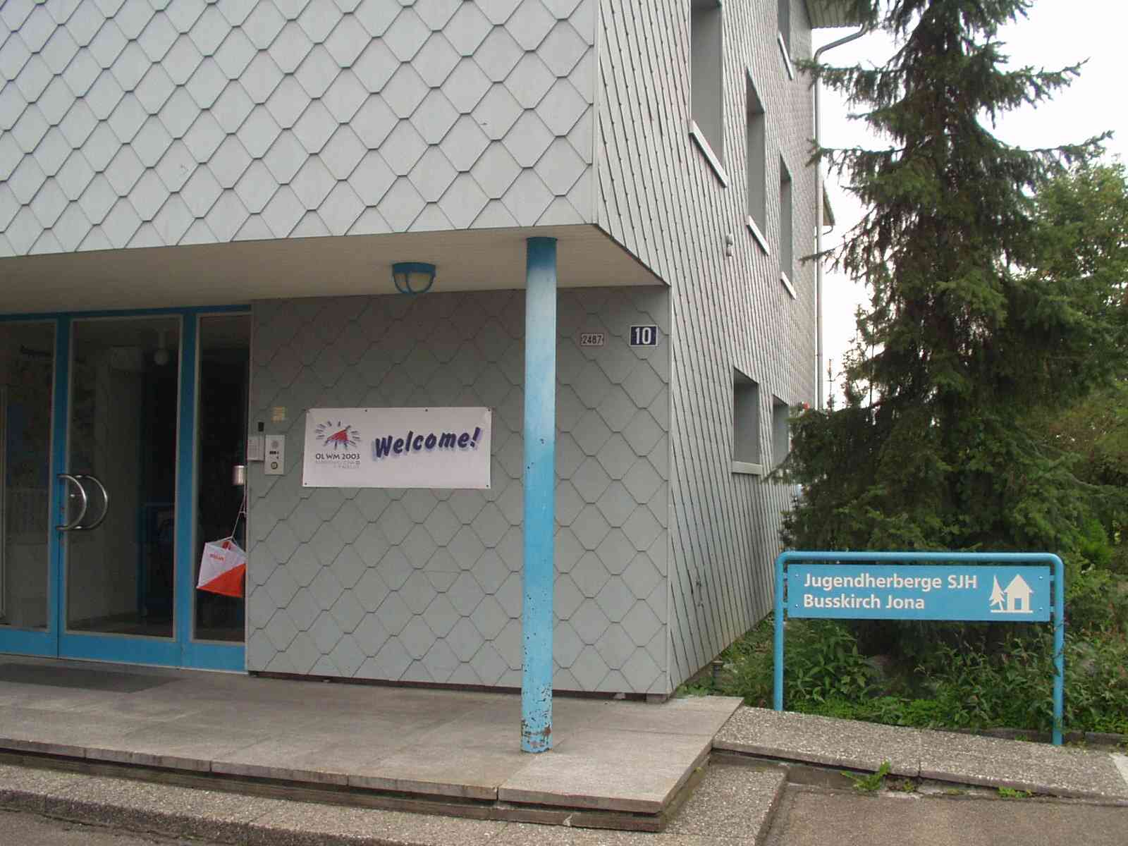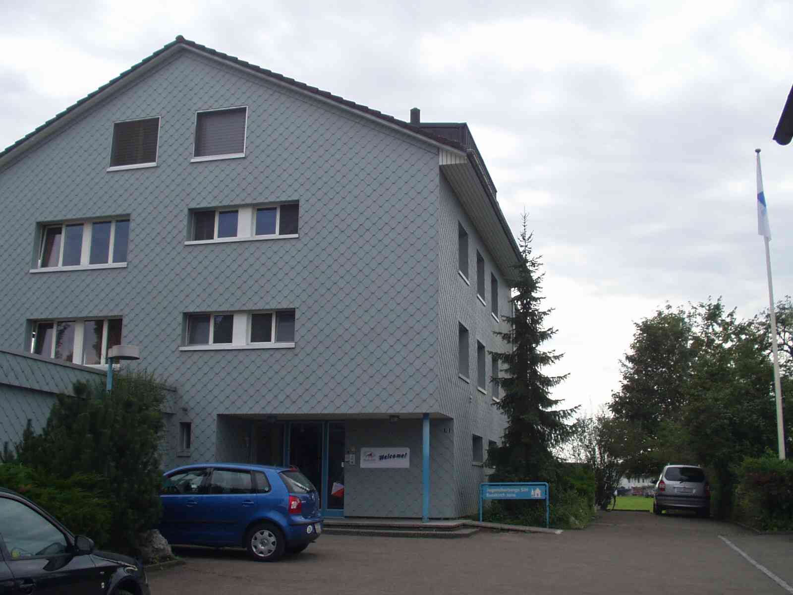 ユースの玄関。Welcomeのサインとフラグが。