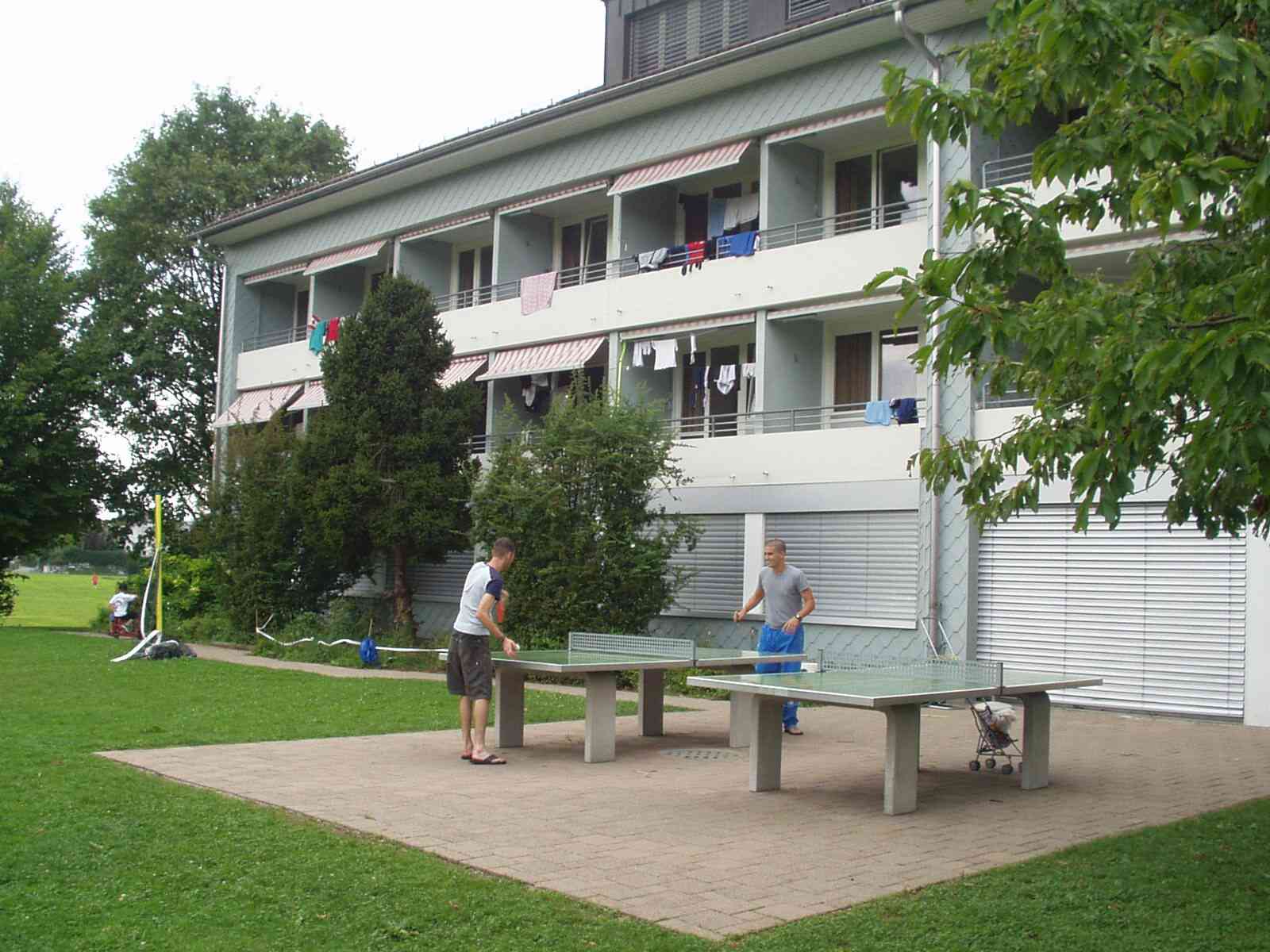 前庭にはバレーコートと卓球台が。JAPANチームはこの2Fの7部屋。