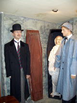 蝋人形のいるスペースがあります。 こちらはホームズとワトソン。 ワトソンがなかなかかわいいのですよ。 ……で、うしろの棺桶(?)のなかにいる、白尽くめのおばさんは誰? |