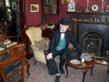 こちらはワトソン博士。……生きてます。ナマです。 日本人だと言ったら、カタコトの日本語で「コニチワー」と挨拶してくれました。 日本人、よく来るみたいです(笑)。 キュートなおじさまでした。 テーブルの上の帽子を指差して、「こっちがホームズので、こっちが僕のね」と教えてくれたとこです。 でも絶対この人、「武術」じゃなくて「バリツ」って言うと思う(断言)。 |