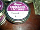 下のお土産コーナー(ん?階下ってことは、ハドソン夫人の部屋か?)で発見した煙草の葉。 Sherlock Holmesブランドです。 しかしそれよりびっくりしたのは、この缶の下半分にかけられた「Smoking Kills」の文字。 イギリスは煙草に対する扱いが厳しくて、街で売られてる煙草は全部こういうメッセージ(他には「早く老化する」とか「肌おとろえる」とか<女心に訴えるメッセージだ)はつけられてるわ、マルボロが3ポンド(約600円)もするわ、と煙草呑みには厳しい環境なんですが、こんなところのまで……。 |