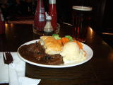 判りにくいかな。 キドニーパイです。 煮込んだ肉と、パイと、手前の白いのはポテト。 日本人のおなかには結構重い………かも。 でもビールとはあいますよv |