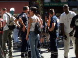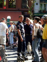 ああ、やっぱり警官なんですね。 どうやらイベントに伴走してるようです。 警官も、ローラースケートで。 イタリアで騎馬警官とか、船のパトカー(※ヴェネツィアは橋が多いので車が走れないから<ていうかカーじゃないし……パト船?)は見たことあるけど、ローラースケートの警官は初めてみた…… |