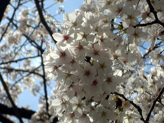 「……パイナップルまるごとって、これはなに?」 「あ、安かったから☆」 国香さん、男前だ……。 (『男前豆腐』を持ってきた私ごときでは、太刀打ちできませんでしたわ<いつの間にか『男を競う会』と化している) でもポテトサラダも鳥肉もねぎぬたあえも豆腐も野菜もビール500ミリ缶6本セットもチューハイもイチゴタルトも全部美味しくいただきました。 パイナップルとイチゴを残してしまったことだけが心残りです……不覚。鯉として。 ■ビールを多分3缶くらいとチューハイ1缶とウィスキーのポケット瓶1本と柚子焼酎。……意外に飲んでないね。しかし写真で観ると、ほんとに『風に吹かれて豆腐屋ジョニー』はむだに長い…… 4月1日(土) いいお天気でした。 家の近くに大きな桜の木がある穴場の公園があって、ちょこっとお花見してきました。 住宅街のなかなのですが、座り込んで騒いでる人もいないし、近所の人だけの楽しみという場所。 下の写真は、そこのではなくて、昨日仕事で外出したときのものなのですが。 関西はまだ咲いてないみたいですが、東京近郊では今週末で終わりでしょう。名残り惜しいけれど、また来年。