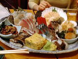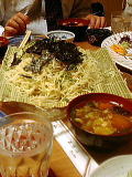 日本初、メロディ付弁当です…………あけると大音量で『故郷』が流れ出します。楽しいよね。それが列車の中でなければね。 蓋の裏の光センサーだ!と気付くまで皆でうろたえました………ええい黙っとけ!と旅行バッグの中に蓋をつっこんで食べたのですが、ときどきバッグを開けると「ピ」と鳴く……広いところで食べようね(笑) さて、今回は関西人には「未知の食べ物」というわけで、町屋さんの要望により月島まで6人でもんじゃを焼きに行くことにしました。場所は私のオススメ、「つきしま小町」。……あ、そういやあんず巻き食べ忘れたよ!