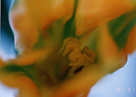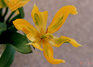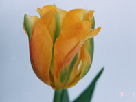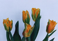 ビリデ咲き(Late-Flowering Tulips、Viridiflora Group) 1959年に登録されたチューリップ アーティストの変異種で輝くようなオレンジの花びらに グリーンはストライプ状に幅広くはいる。