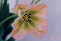 グリーンのフレイムをもった淡いピンクの縁取りの花。