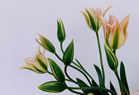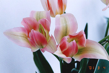 ビリデ咲き(Late-Flowering Tulips、Viridiflora Group) 私の持ってる本には詳しい資料がありません。 花の形は、花びらがとんがってユリ咲き風、花びらに緑のフレイムがあります。 サテンのような光沢のあるピンクの花びらが美しい。