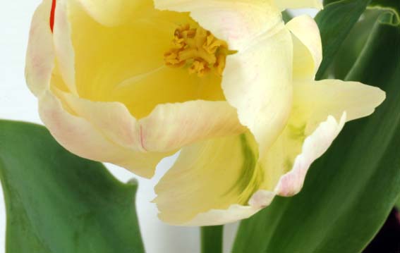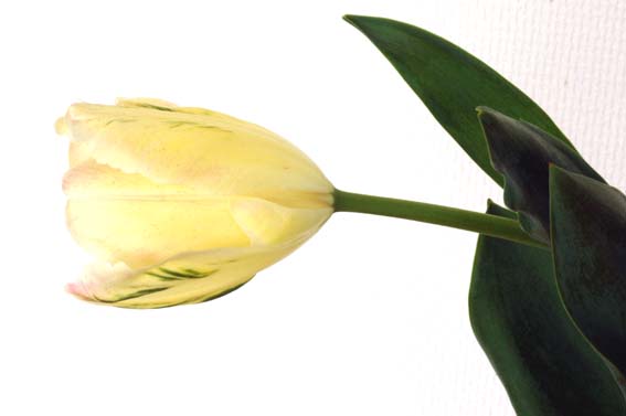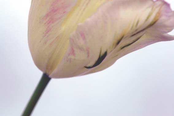 クリームの地色に薄いピンクと緑と複雑な色合いのチューリップ