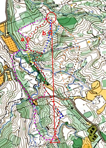 まあ、それぞれ一長一短があるので何とも言えませんが、やはり右回りはアップがあって損ですが、その分アタックは楽になります。それを見越してからなのか、正面のピークを登った後に一旦やぶの植生界にぶつけて右からアタックするという人もいました。左からのアタックがそれほど苦労せずにできる人には、この左からのルートが一番得でしょう。