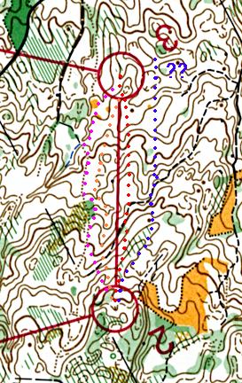 レッグ線方向に沿って比較的分かり易い尾根・沢筋および傾斜変換が存在し、最後もコントロール手前のピークが使えるので、ルートプランを立てる材料には事欠かないだろう。問題は如何に確実な部分をうまく使ってナビゲーションの簡略化を図るかである。さらに実際に実行する上では、その中で特に押さえることを意識する必要があることが分かる。